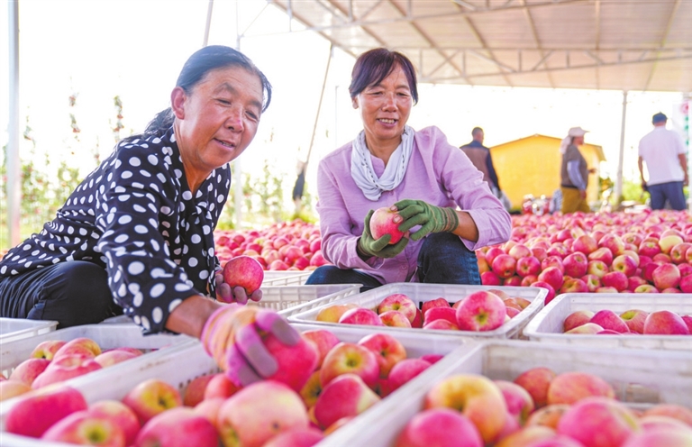 金秋时节,吉县壶口镇柏东村新品种“美味”苹果喜获丰收。图为9月13日,果农们在分拣装筐。