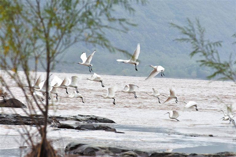 寒露时节,吉县壶口瀑布附近水域水鸟日渐增多,一些向南方迁徙的候鸟选择在此落脚。它们或休憩、或戏水、或展翅飞翔,为壶口瀑布景区增添了一道靓丽风景。图为10月8日在瀑布上游水域拍摄的水鸟。