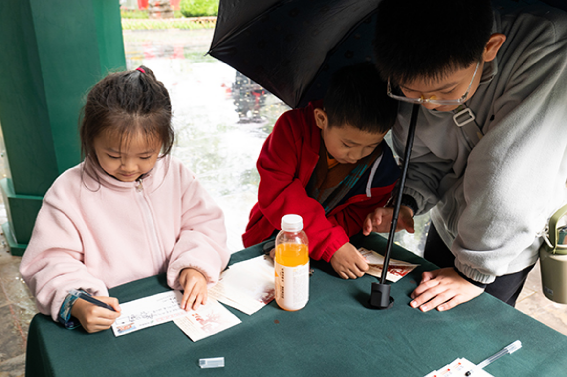 第一位体验的小朋友在爸爸的鼓励下坐到桌前,在明信片上工工整整地写下了自己的寄语,填写信息后,郑重地投入邮筒。孩子爸爸表示,以前寄信很常见,但现在手机通信方便,小朋友基本都没有自己写过信或者写明信片再邮寄出去,就想让她亲身尝试一下。