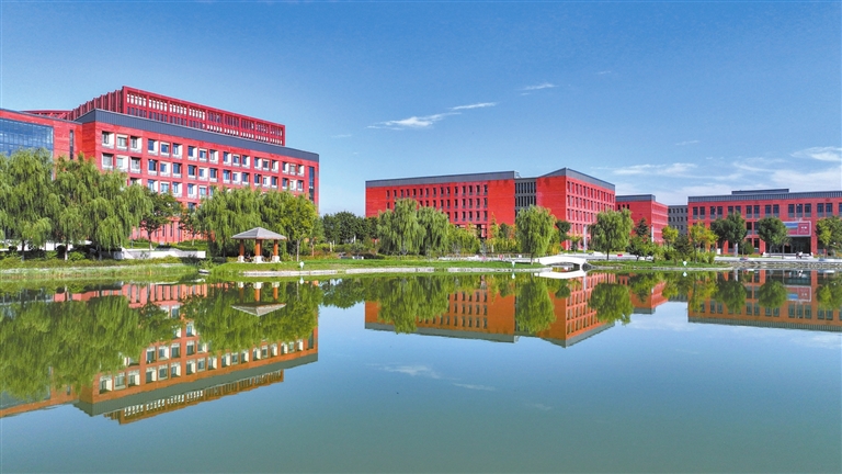 10月15日,在山西电子科技学院,校园建筑与隐秀湖相映成趣。秋日里的山西电子科技学院,红棕色调的建筑与湖面光影交错,虚实交织,在悠远与宁静中宛如一幅优美的诗意画卷。