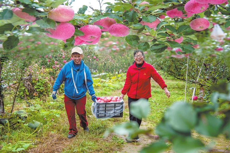 近期,连续降雨给苹果收获带来不利影响。为减少果农损失,我市各地积极协调机械与人力,全力帮助果农减少产后损失,拓宽销售渠道。图为10月20日,霍州市李曹镇关家崖村果农趁晴好天气采摘、分拣苹果。