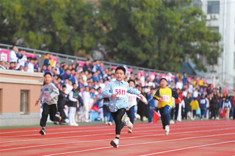 连日来,我市各地中小学陆续举办秋季运动会,在运动比赛中融合竞技、趣味、协作于一体,增强学生体质,激发师生对体育运动的热情,展现出昂扬向上的精神风貌。图为近日,市解放路小学100米竞赛跑比赛现场。
