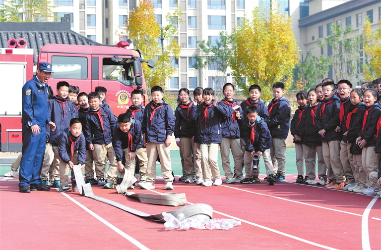11月4日,在临汾一中第一附属学校消防体育课上,学生们进行“水带保龄球”比赛。全国消防宣传月期间,尧都区消防救援大队20名校外辅导员走进中小学校园,开展多种形式消防安全教育活动,提升学生消防安全素养和自防自救能力。