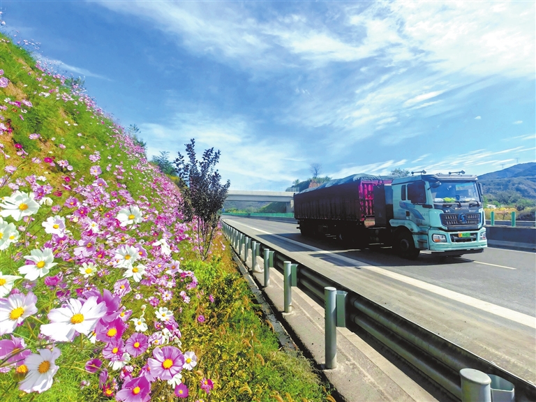 近日,在国道341古县下冶段,宽阔的公路上,公路两侧的边坡上大片色彩缤纷的花朵绚烂绽放,有粉色、白色等,在蓝天、白云的映衬下,与远处的桥梁、山峦共同构成了一幅清新且富有生机的画面,展现出公路沿线独特的自然与交通交融之美。