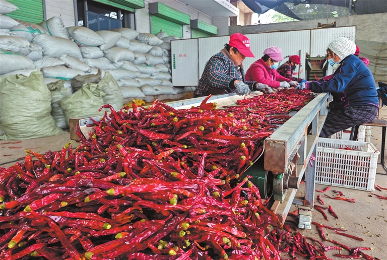 近年来,襄汾县赵康镇的辣椒产业已形成育苗、种植、烘烤、加工、销售为一体的产业链发展模式,有力带动当地农民增收、农业增效。图为11月7日,该镇赵雄村一家辣椒种植合作社的椒农在分拣辣椒。