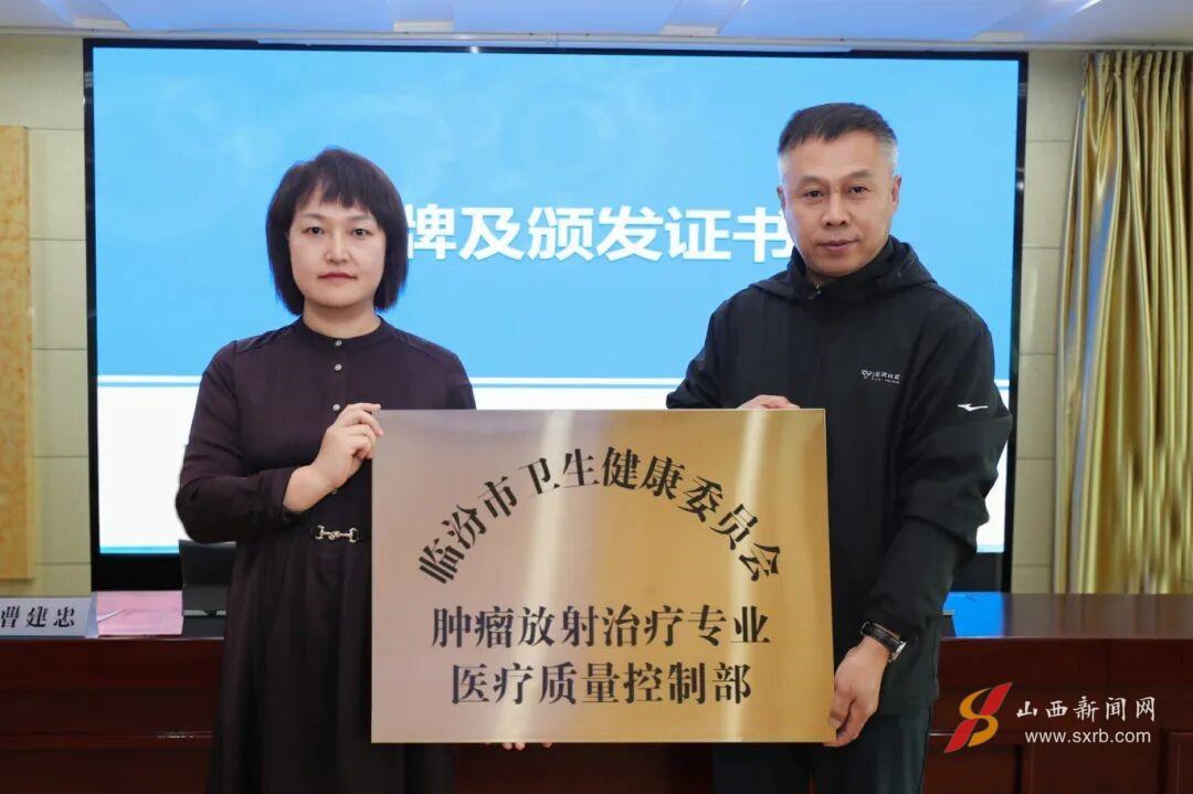 成立仪式上,毛崇澜调研员向临汾市中心医院胸部肿瘤一科主任张东峰正式授予了“临汾市卫健委肿瘤放射治疗专业质控部”牌匾,并颁发了质控部主任及专委会主任委员证书。