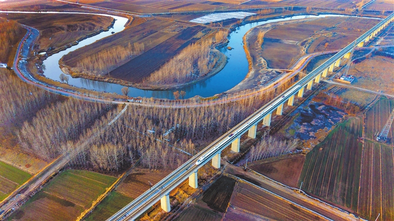 12月14日,航拍镜头下的侯马市高村乡西台神村附近,一列动车组列车在大西高铁上疾驰而过,与蜿蜒汾河及周边绿化带共同构成一幅冬日美景。近年来,侯马市不断加大汾河、浍河治理力度,持续推进生态建设,沿岸展现出秀美风光。