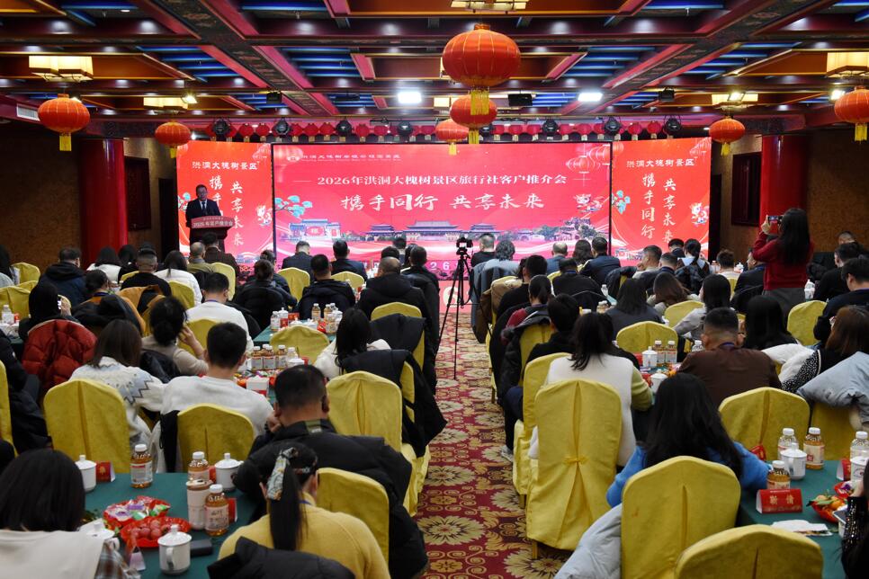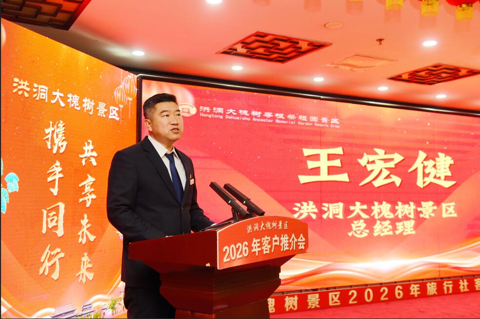 1月3日,洪洞大槐树景区“携手同行,共享未来”2026年度客户推介会在景区民俗饭店隆重举行。该景区总经理王宏健及领导班子成员,与壶口瀑布、平遥古城、乔家大院、小西天、云丘山等兄弟景区代表,以及来自省内外的近百家旅行社负责人齐聚一堂,共话合作、共谋文旅发展新篇章。
