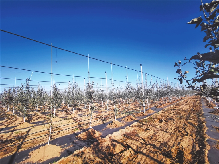 一排排水泥立杆密集而整齐地矗立,立杆之间的四道银色铁丝在空中划出笔直的线,稳固支撑着幼树,株距仅1.5米、行距4米的果树行列整齐,拇指粗细的苹果树苗透着勃勃生机……隆冬时节,古县南垣乡东池村的现代苹果产业示范基地里,呈现出一幅生机勃勃的图景。