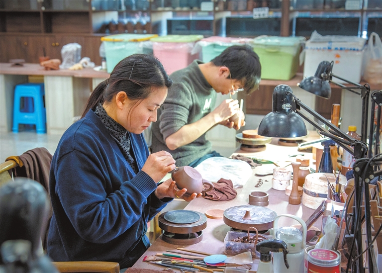 1月16日,在乡宁县紫砂陶小镇生产车间,工人们正在加紧制作紫砂工艺品,以完成客户订单。