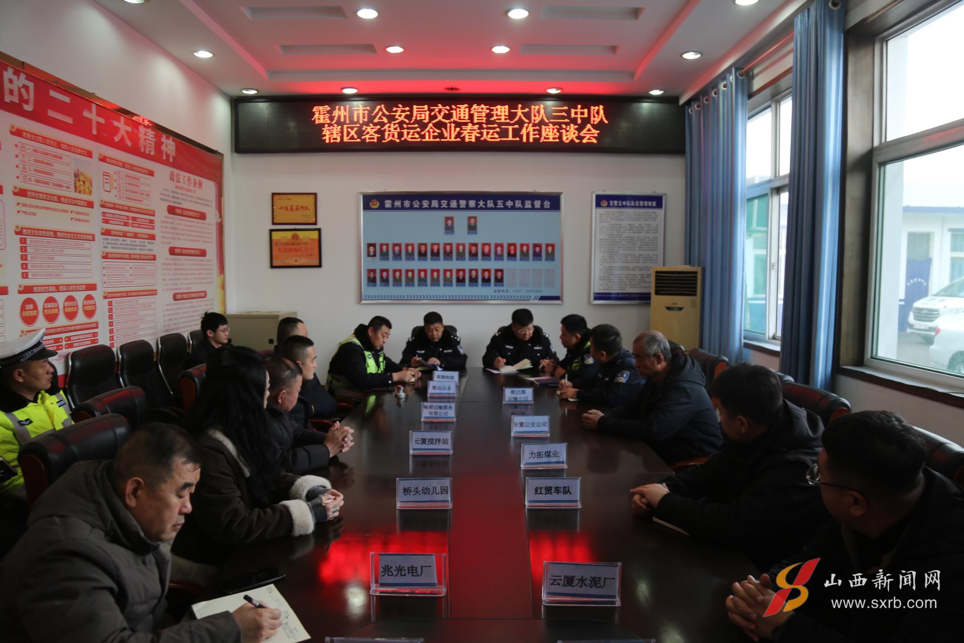 为保障春运期间道路交通安全、畅通,给群众欢度新春佳节创造平安、和谐的道路交通环境,2月3日,霍州市公安局交通管理大队三中队组织辖区客货运企业开展“平安春运 交警同行”主题培训座谈会,让安全意识提前扎根,守护好每一条归家之路。