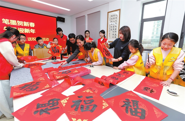 2月10日,在尧都区解放路街道平阳社区党群服务中心,一场以“大手拉小手笔墨迎新春”为主题的社区写春联和福字活动热闹开展,来自社区的书法爱好者和少年儿童书法爱好者联袂“献艺”,通过“大手拉小手”的形式搭建文化传承的桥梁,在一撇一捺间营造了浓浓的新春喜庆氛围。