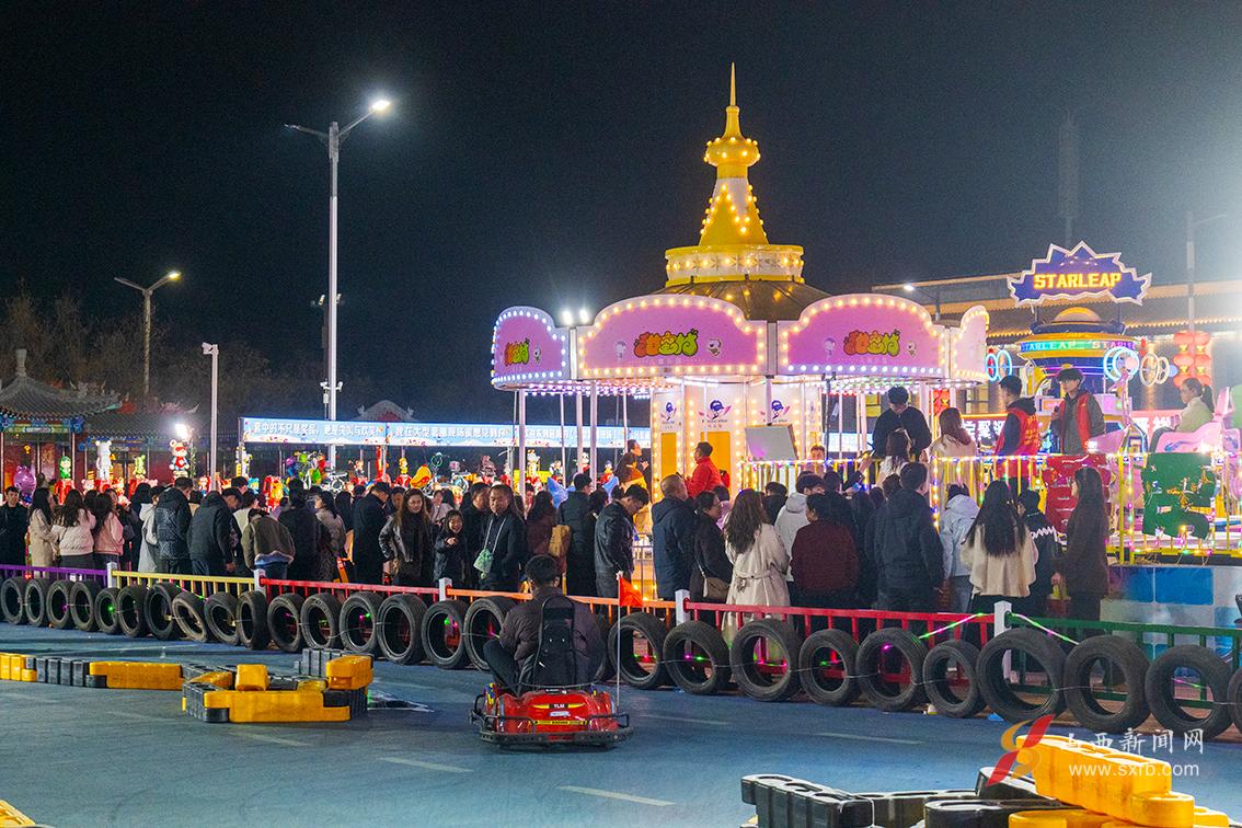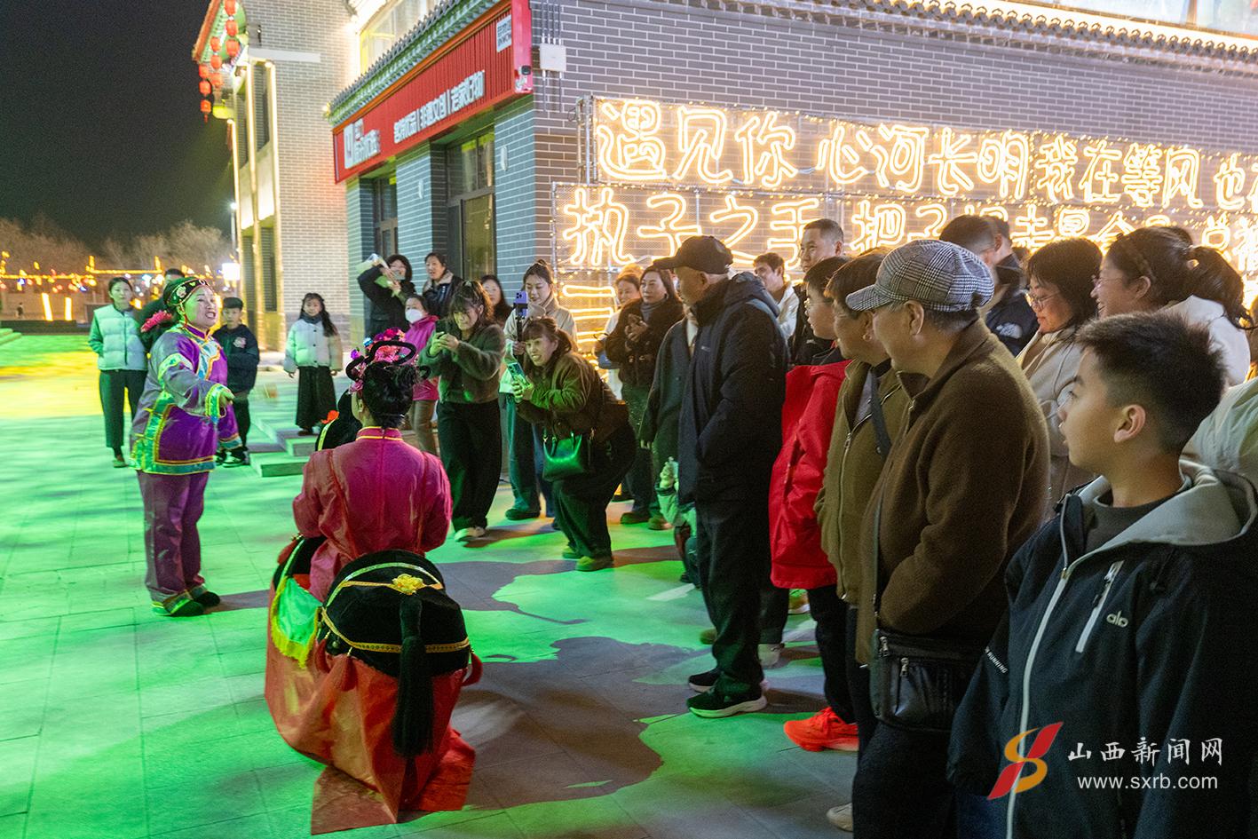 夜幕降临,槐树里商业街区瞬间变身为流光溢彩的光影世界。“槐光夜宴主题灯会”璀璨点亮整个夜空,其中“古槐映月”“千里归乡”等设计精巧的网红灯光造型,成为了游客们争相合影的热门打卡点。配合着唯美的灯会,《民俗洪洞范儿》《新春烈焰秀》《萌偶热舞派对》等精彩表演接连登场,将夜晚的欢乐氛围一次次推向高潮,热闹景象丝毫不减日间。
