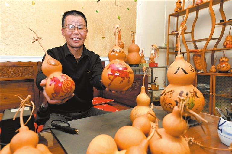 2月26日,尧都区尧庙镇王庄村的民间手艺人郭金刚在展示自己的葫芦烙画作品“福来‘临’”。马年新春,郭金刚将葫芦烙画与节日主题巧妙融合,将人们对新春的美好期盼通过小小的葫芦表达出来,让传统技艺在新时代焕发出新的光彩。