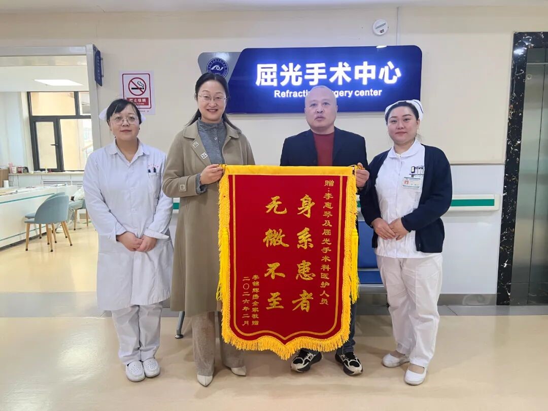 2月26日,小李的家长特意定制了一面写有“身系患者,无微不至”的锦旗送到了该院屈光手术中心。鲜红的锦旗背后,是医者对职业的深情承诺,也是患者对医护最真实的感受。