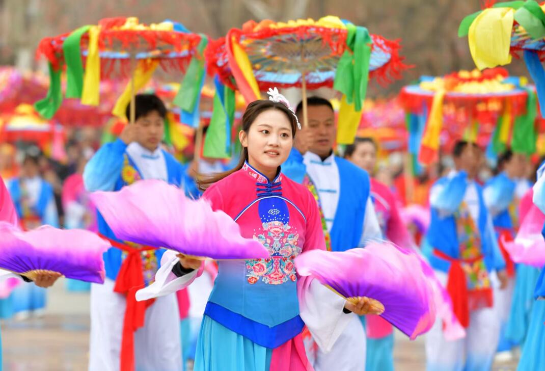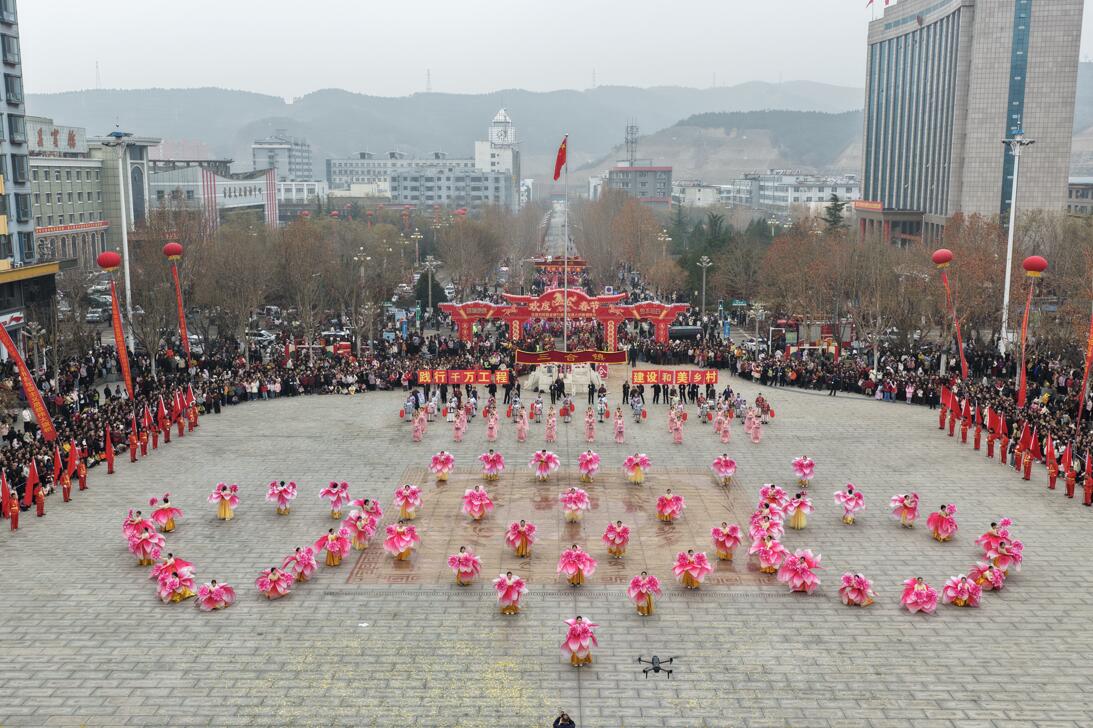 教体系统带来的鼓舞《阵前月—少年行》将战鼓的刚劲、剑阵的锋芒与水袖的柔美融为一体。彰显教育人将以“乘风破浪”的斗志,让古岳大地的教育事业如骏马般一往无前。旧县镇的表演独具特色:秧歌队员身着传统服饰,手持连翘、黄芩等中药材模型,在“药香满镇”的布景中翩然起舞。